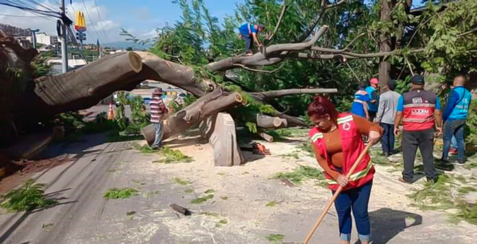 Muchos conductores de vehículos pequeños, así como de motocicletas, pasaron por debajo del árbol, que fue hecho pedazos por un equipo del Comité de Emergencia Municipal (Codem).