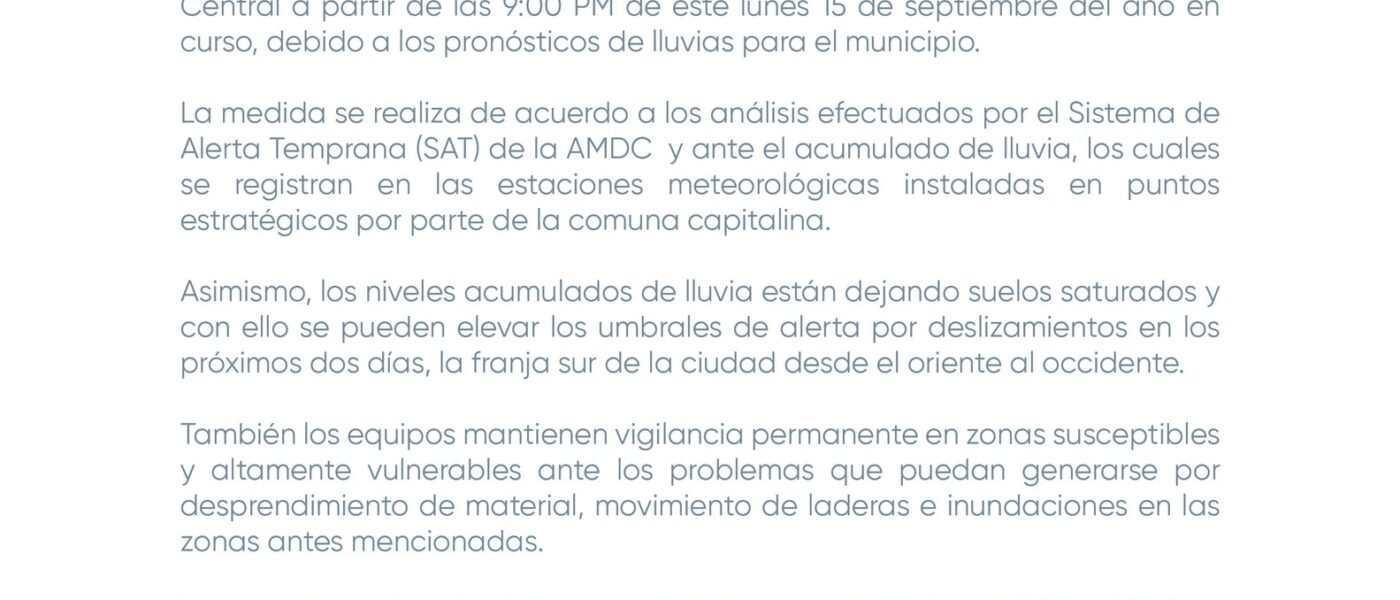 La medida entró en vigencia a las 9:00 p. m. tras el análisis del Sistema de Alerta Temprana (SAT).