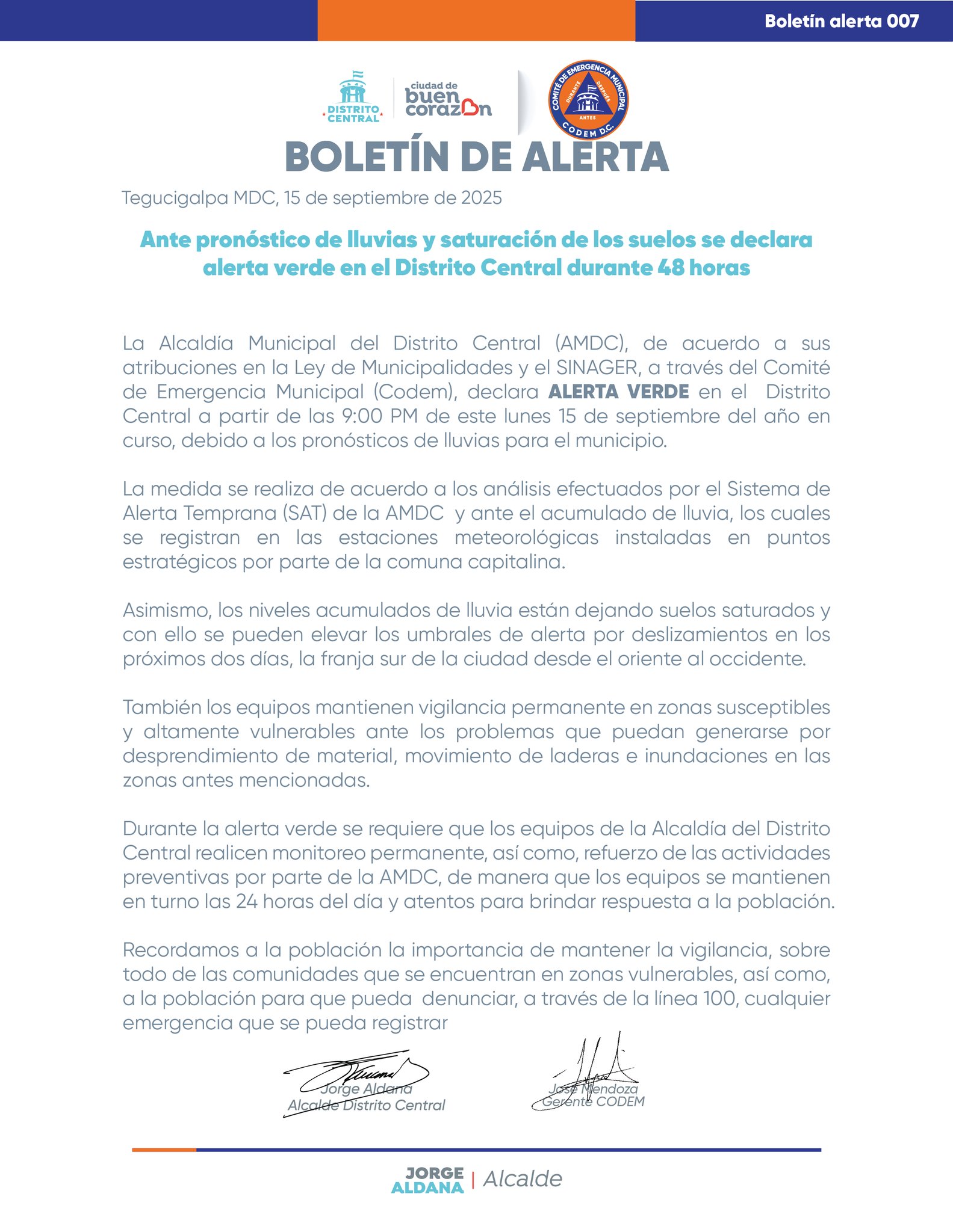 La Alcaldía Municipal del Distrito Central (AMDC) declaró este lunes alerta verde por 48 horas en la capital, debido a los pronósticos de lluvias y la saturación de los suelos.