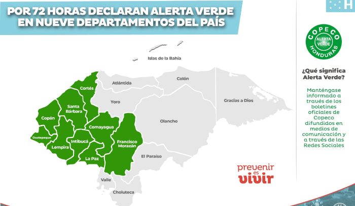 La Secretaría de Gestión de Riesgos y Contingencias (Copeco) emitió una Alerta Verde para nueve departamentos del país, además de varios municipios situados a lo largo de las orillas de los ríos Ulúa y Chamelecón.