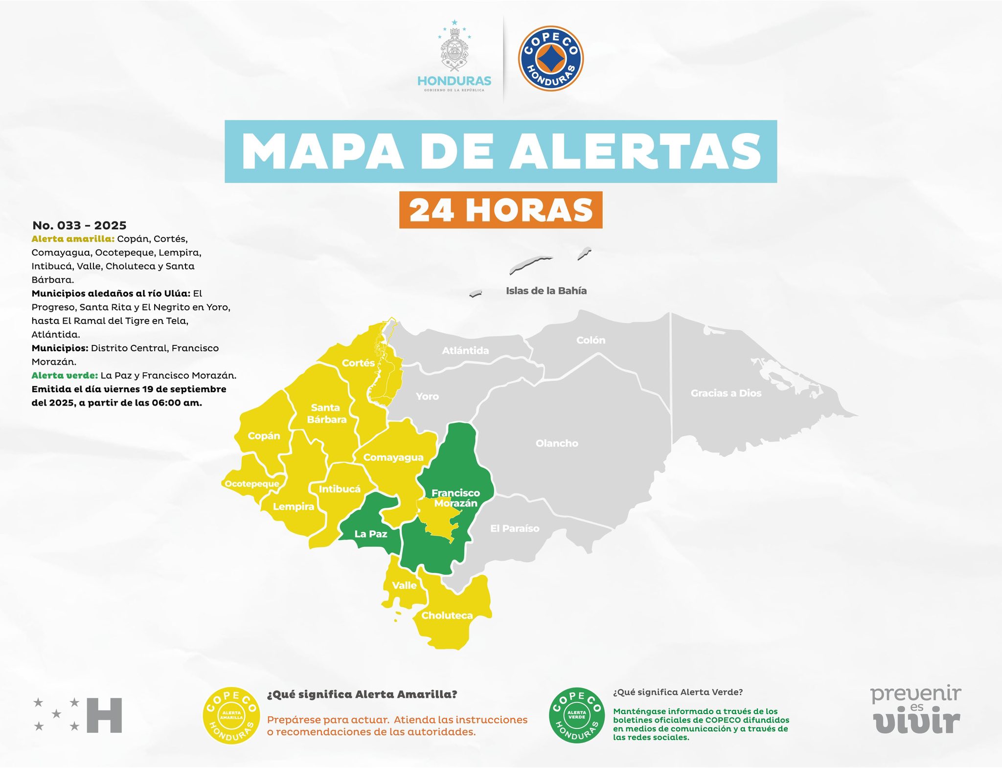 Por otro lado, se amplía la Alerta Verde para los departamentos de La Paz y Francisco Morazán, con una duración de 24 horas a partir de las 6:00 a. m. del viernes 19 de septiembre de 2025.