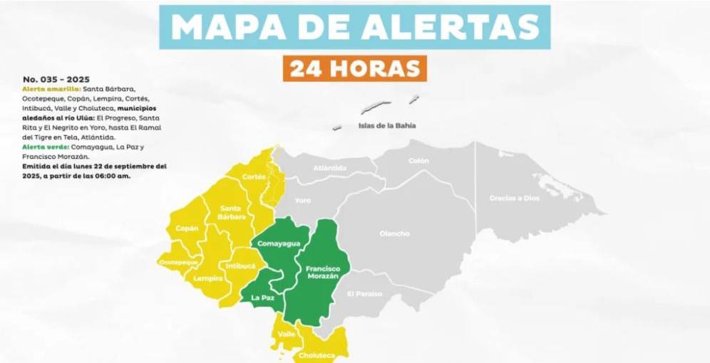 La Secretaría de Gestión de Riesgos y Contingencias Nacionales (Copeco) mantiene este lunes la alerta amarilla en los departamentos de Santa Bárbara, Ocotepeque, Copán, Lempira, Cortés, Intibucá, Valle y Choluteca, así como en los municipios aledaños al río Ulúa: El Progreso, Santa Rita y El Negrito (Yoro), hasta El Ramal del Tigre en Tela, Atlántida.