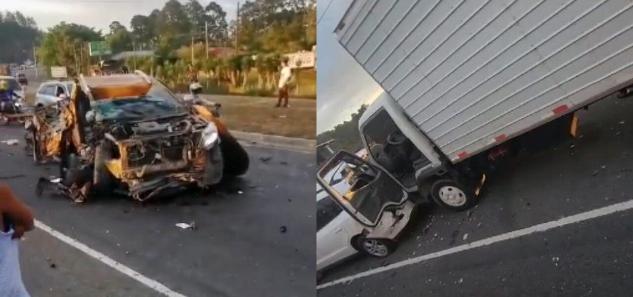 Unos seis carros, entre ellos, un camión, se vieron involucrados en un fuerte accidente de tránsito ocurrido el domingo por la tarde en la carretera CA-5 Norte a la altura de la comunidad de Zambrano, al salir de Francisco Morazán hacia el norte de Honduras.